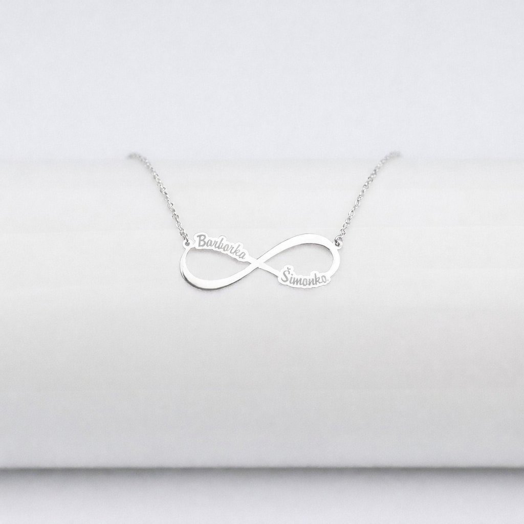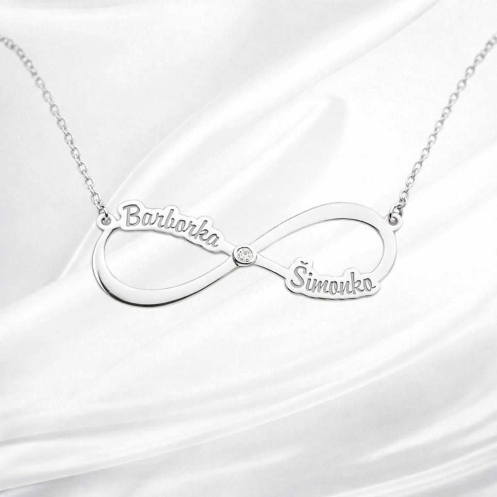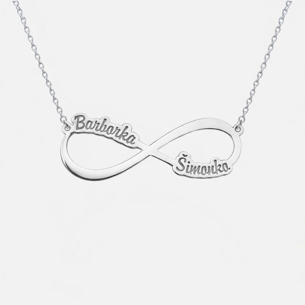 Stříbrný personalizovaný náhrdelník se symbolem nekonečna a dvěma jmény