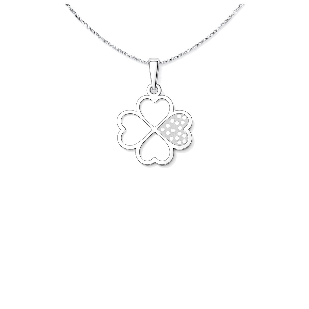 Stříbrný přívěsek ve tvaru čtyřlístku je tvořený čtyřmi srdíčky, která společně vytvářejí harmonický celek plný pozitivní energie. Minimalistické linie doplňuje decentní tečkovaná struktura na jednom lístku, která šperku dodává jemný detail a moderní nádech.