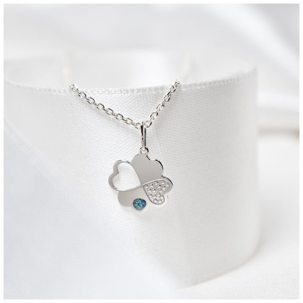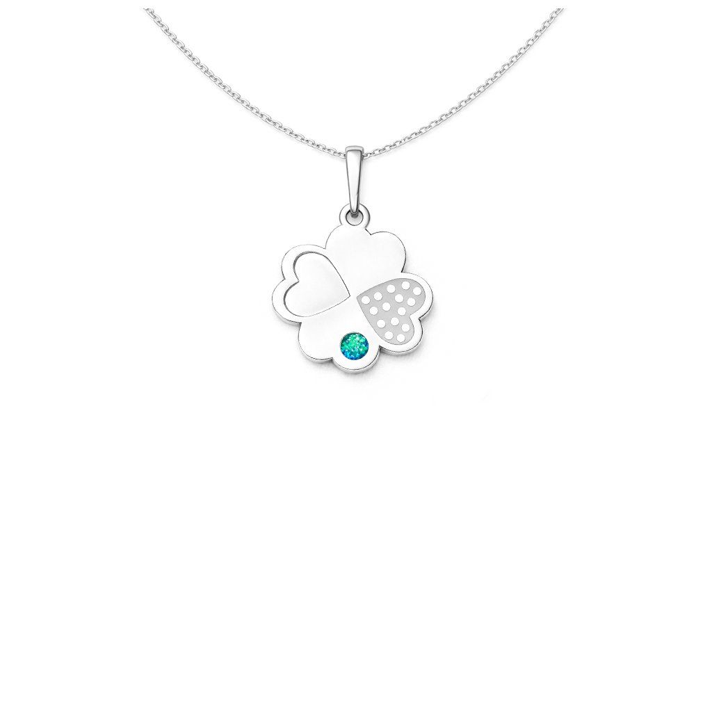 Jemný přívěsek ve tvaru čtyřlístku zaujme hravým designem, ve kterém se spojují srdíčka a drobné dekorativní detaily. Dominantním prvkem je barevná modrozelená tečka, která šperku dodává svěží akcent a podtrhuje jeho jedinečný charakter.
