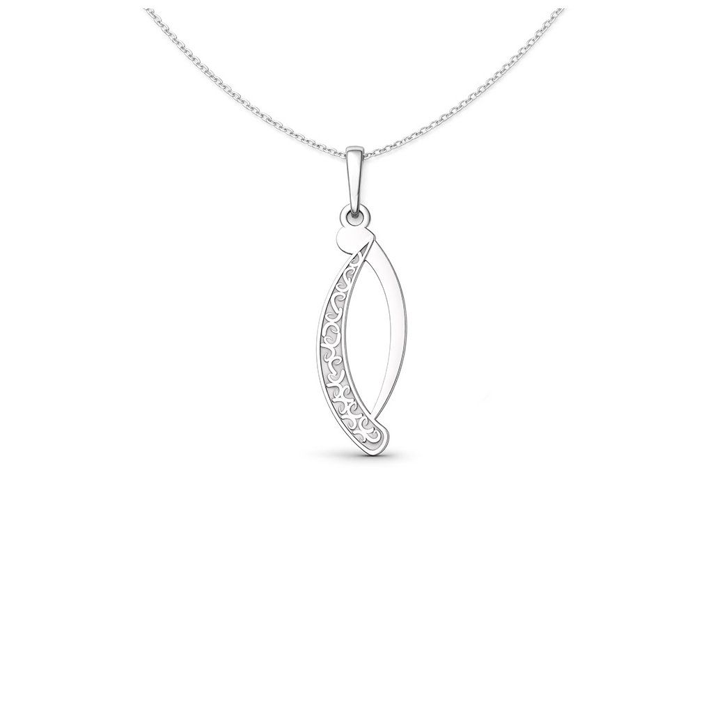 Moderní stříbrný přívěsek tvoří dvě jemně prohnuté linie, které spolu vytváří elegantní a vzdušný tvar. Jedna linie je čistá a hladká, druhá zdobená jemným ornamentem, který dodává šperku zajímavý detail a kontrast.