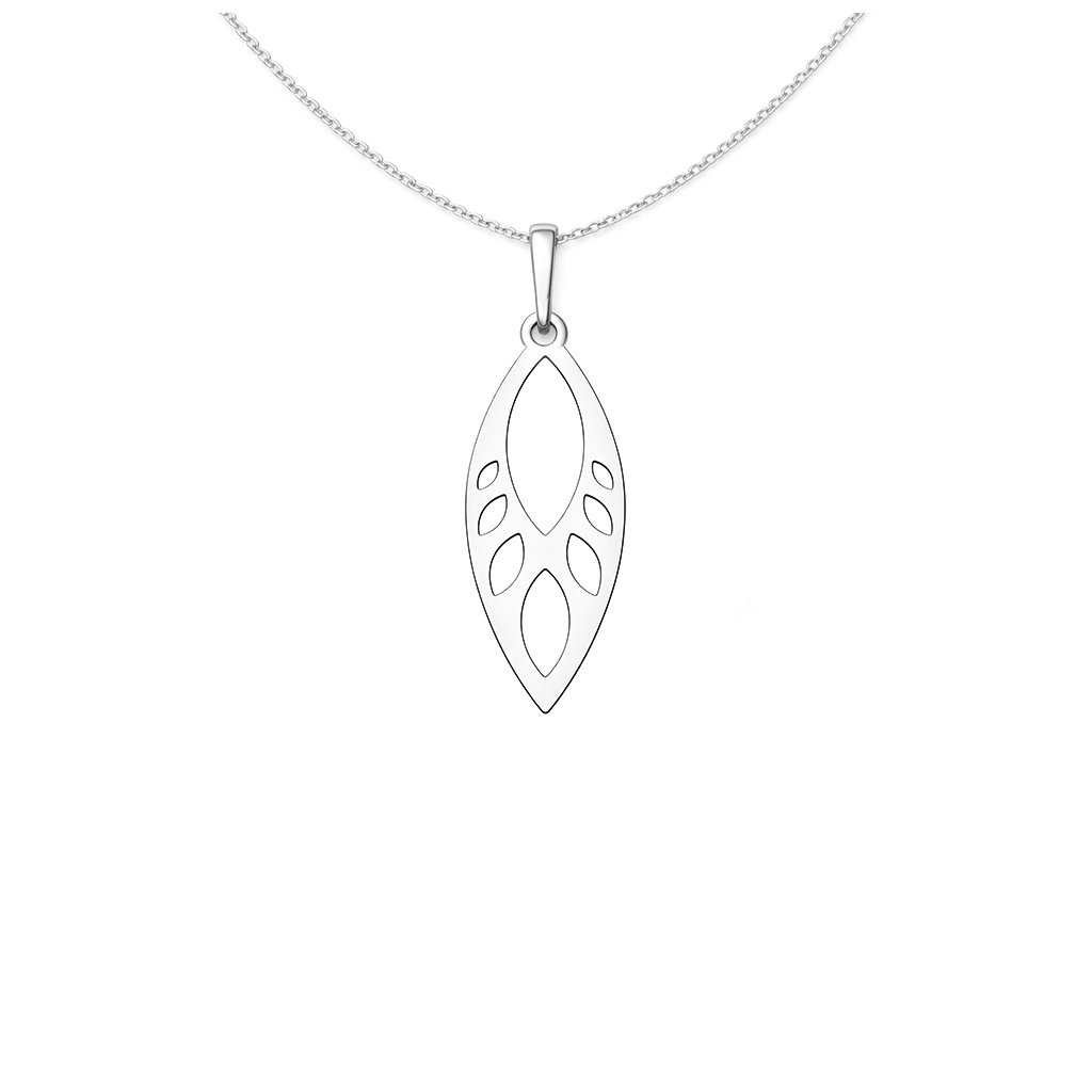 Elegantní stříbrný přívěsek zaujme svým protáhlým tvarem a jemným prořezávaným vzorem, který vytváří lehký a vzdušný vzhled. Minimalistické linie dodávají šperku moderní a nadčasový charakter, díky kterému se snadno kombinuje s různými styly.