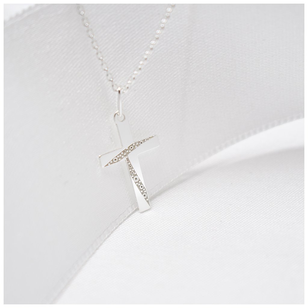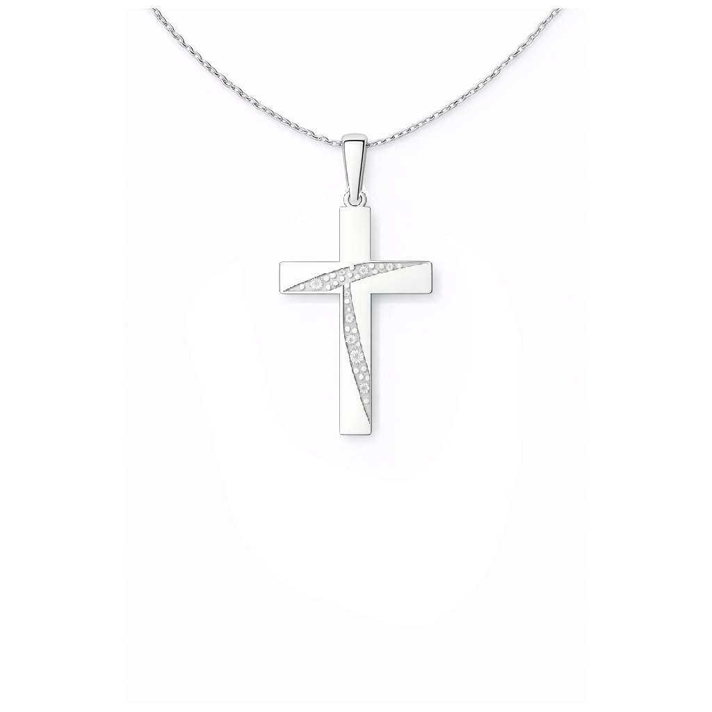 Elegantní stříbrný přívěsek ve tvaru kříže zaujme moderním a zároveň nadčasovým zpracováním. Hladké lesklé linie jsou doplněny jemně strukturovaným gravírováním vedeným diagonálně středem kříže, které dodává šperku jemný třpyt a hloubku.