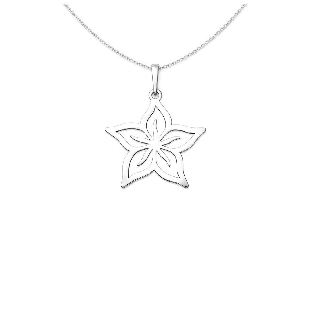 Stříbrný přívěsek ve tvaru stylizovaného květu zaujme svou čistotou a symetrickým designem. Prořezávané okvětní lístky vytváří lehký a vzdušný vzhled, který působí elegantně a nadčasově.
