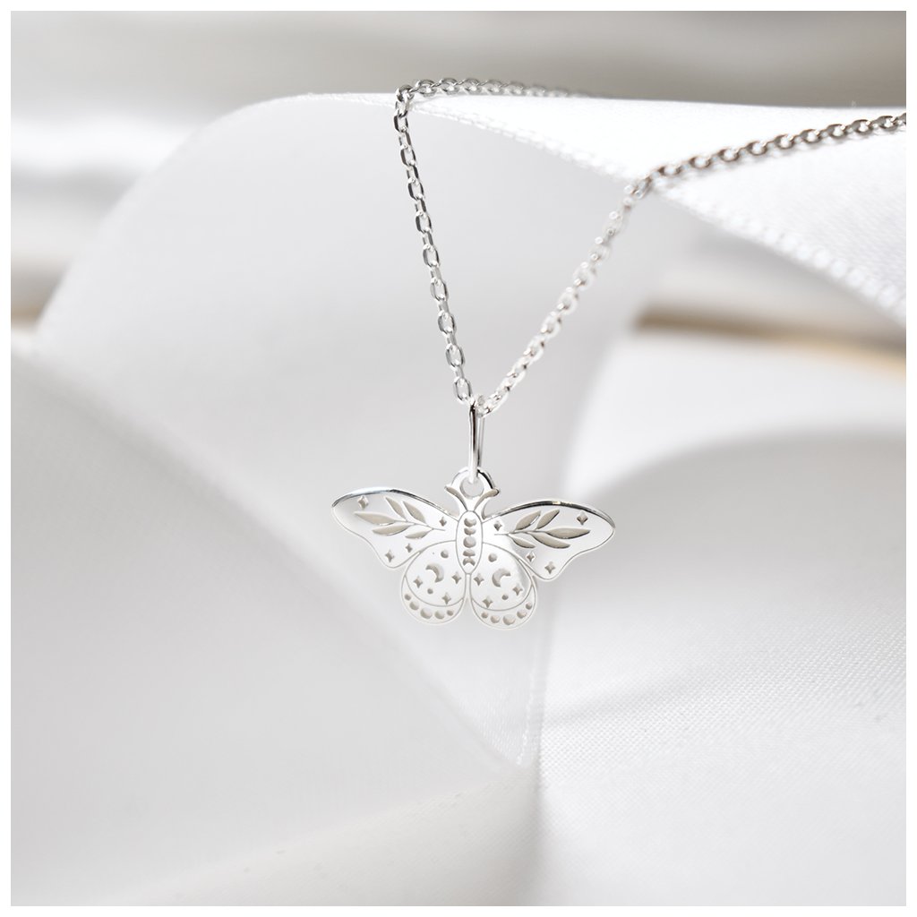 Jemný stříbrný přívěsek ve tvaru můry představuje tajemnou krásu noci, klid a tichou sílu vnitřní proměny. Detailně zdobená křídla dodávají šperku lehkost a elegantní hloubku.