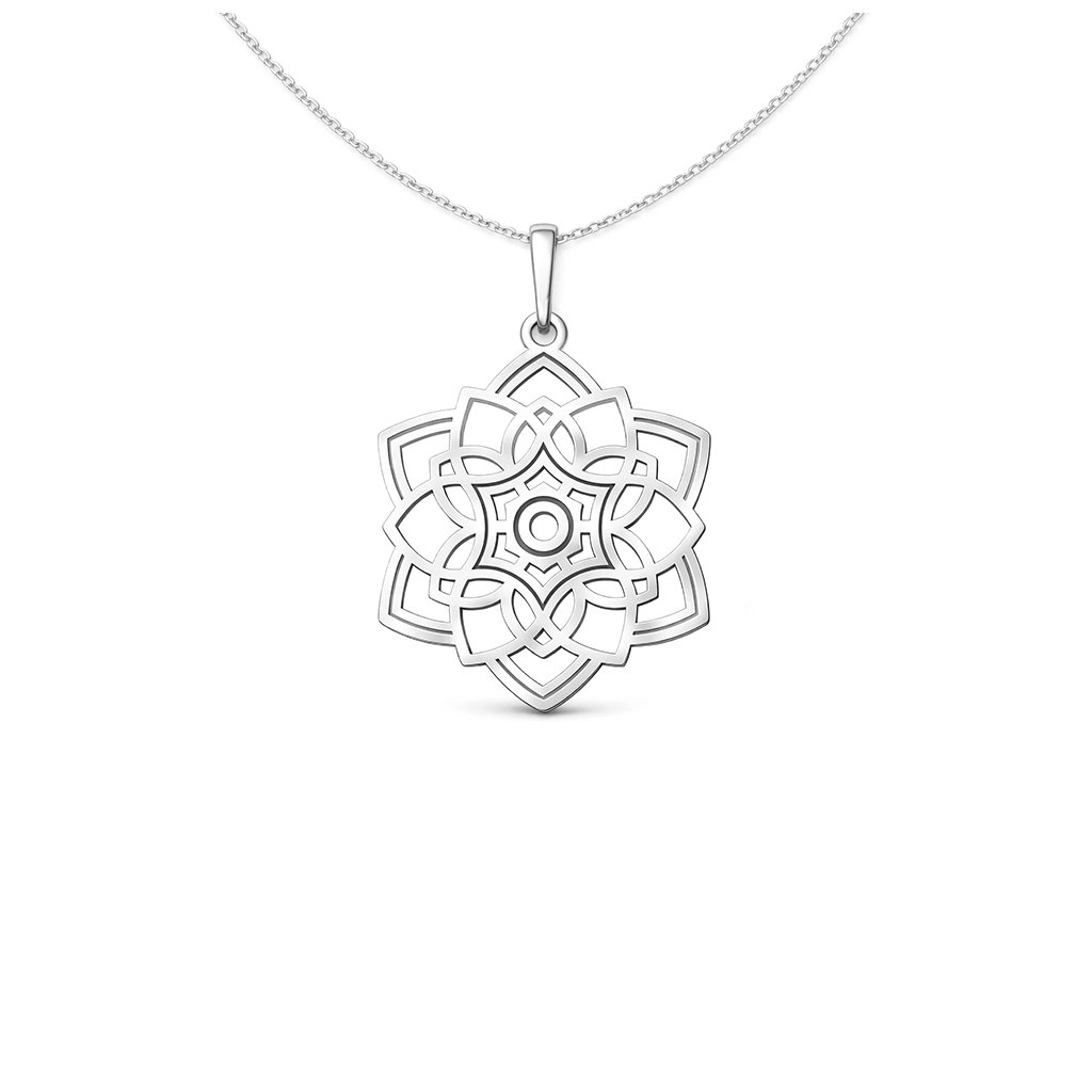 Elegantní stříbrný přívěsek s motivem mandaly zaujme propracovaným ornamentálním vzorem, který vytváří jemnou a vyváženou kompozici. Prořezávaný design působí lehce a vzdušně, díky čemuž šperk krásně vynikne na krku a dodá každému outfitu nádech elegance.
