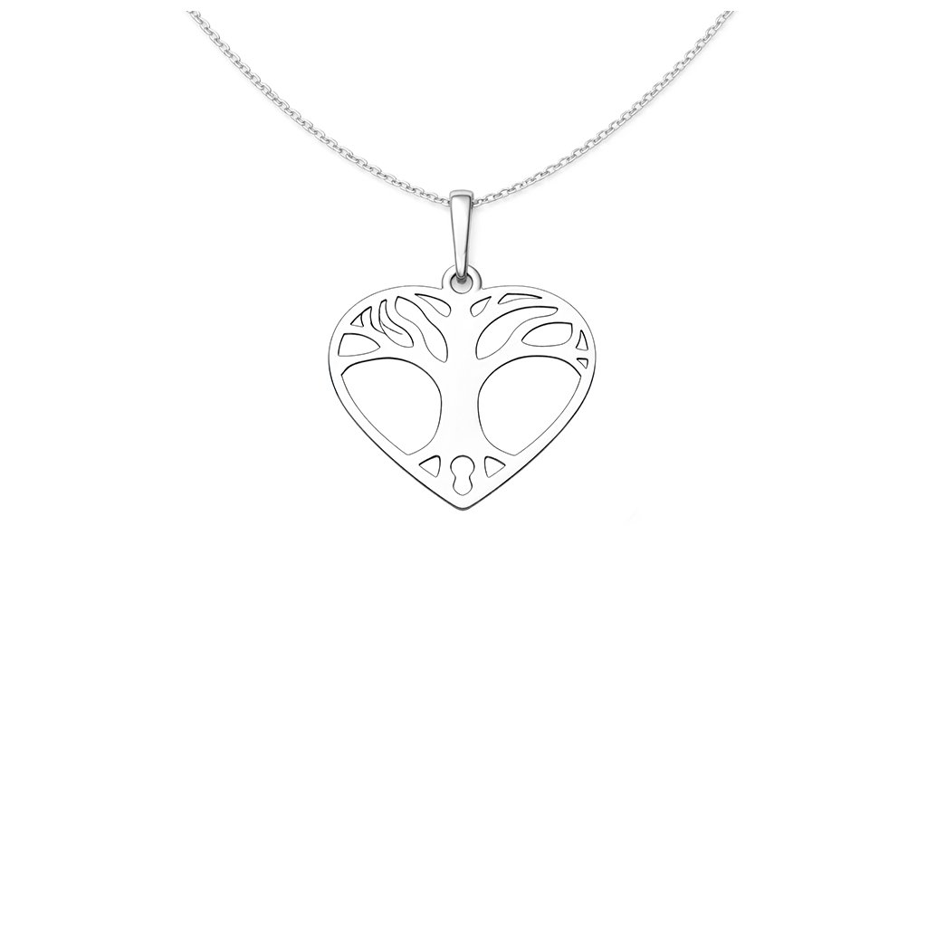 Jemný stříbrný přívěsek ve tvaru srdce zdobí stylizovaný motiv stromu, jehož větve se přirozeně rozprostírají po celé ploše šperku. Prořezávaný design dodává přívěsku lehkost, eleganci a moderní vzhled, díky kterému krásně vynikne při každodenním nošení.