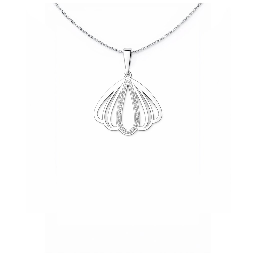 Jemný stříbrný přívěsek ve tvaru mušle představuje symbol ochrany, zrození a harmonie s přírodou. Elegantně rozevřené linie vytvářejí lehký a vzdušný design, který působí jemně a zároveň luxusně.