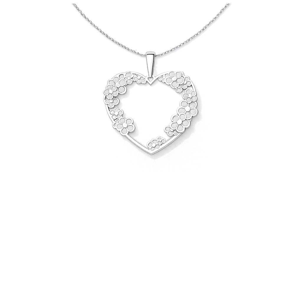 Jemný stříbrný přívěsek ve tvaru srdce je zdoben drobnými kvítky, které vytvářejí lehký a romantický motiv plný harmonie. Otevřený design působí vzdušně a elegantně, ideální pro každodenní nošení i výjimečné chvíle.