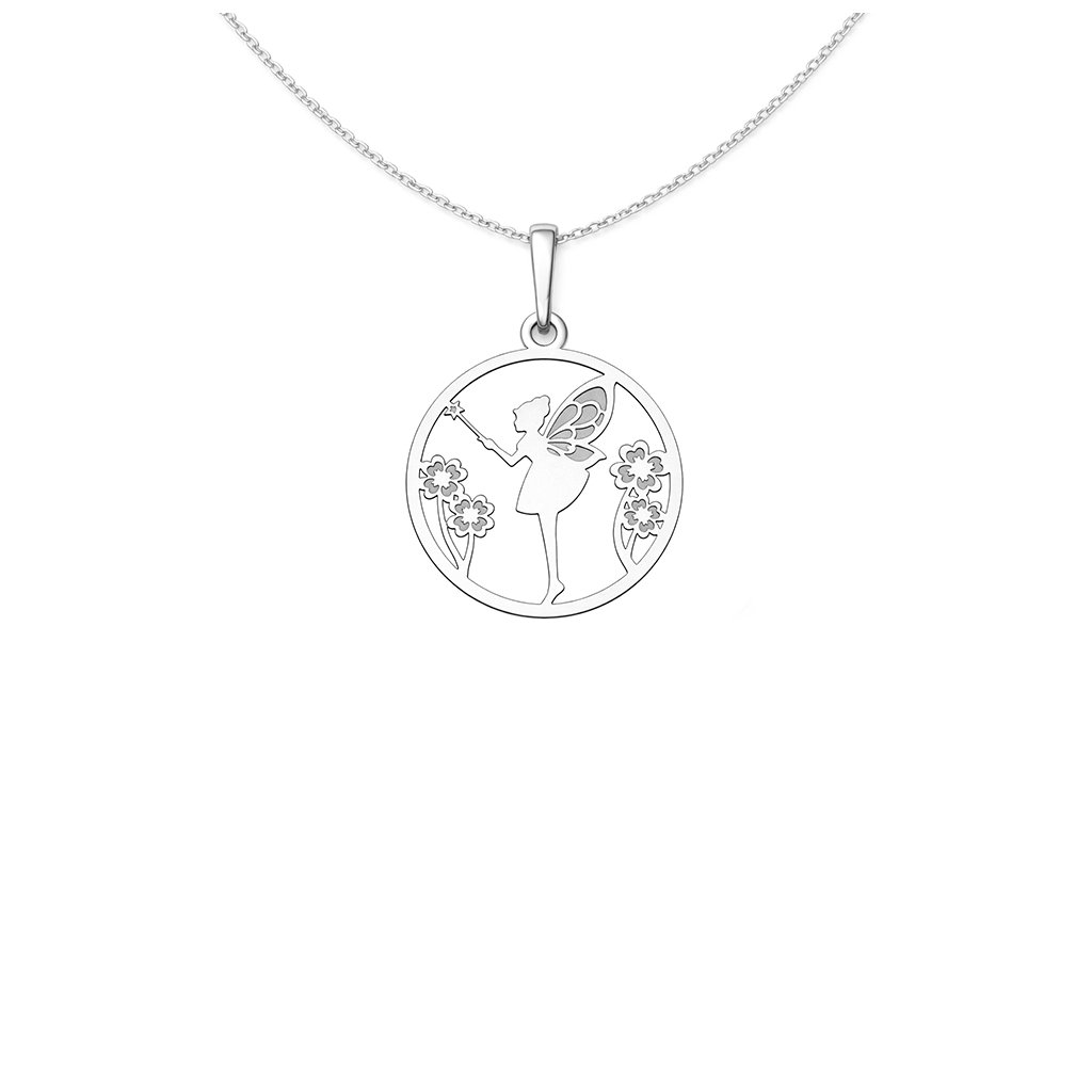 Jemný stříbrný přívěsek s motivem víly zaujme romantickým a hravým designem. Silueta víly s křídly je zasazena do kulatého rámu a doplněna jemnými květinovými motivy, které šperku dodávají pohádkovou atmosféru a lehkost.