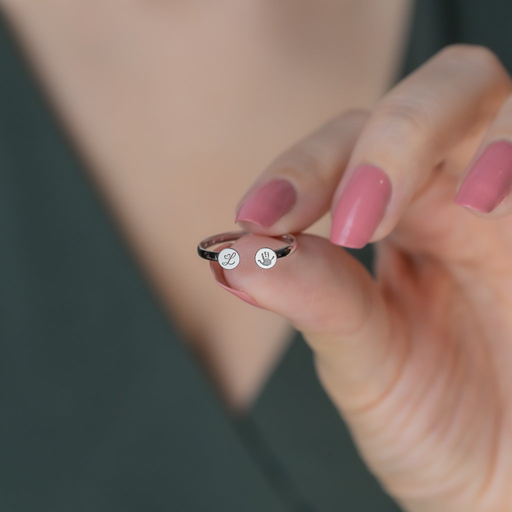 Podoba prstenu je však zcela na vás. Můžete zvolit kombinaci iniciály a otisku, dva otisky bez písmene nebo pouze písmena – finální vzhled vzniká podle vaší vlastní představy.