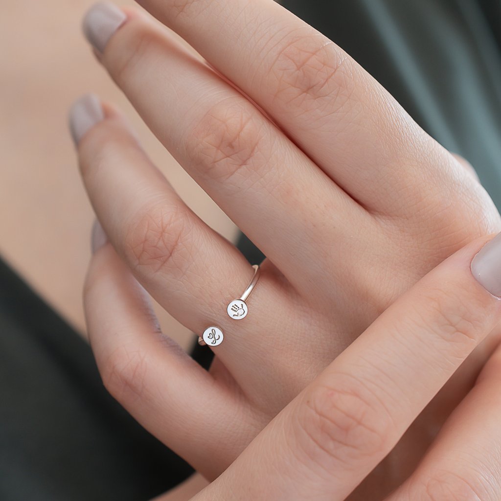 Jemný prsten ze zlata 14k 585/1000 s gravírováním do dvou medailonků. Každý kus vytváříme na míru s láskou a pečlivostí, jako vzpomínku, která nikdy nevybledne.